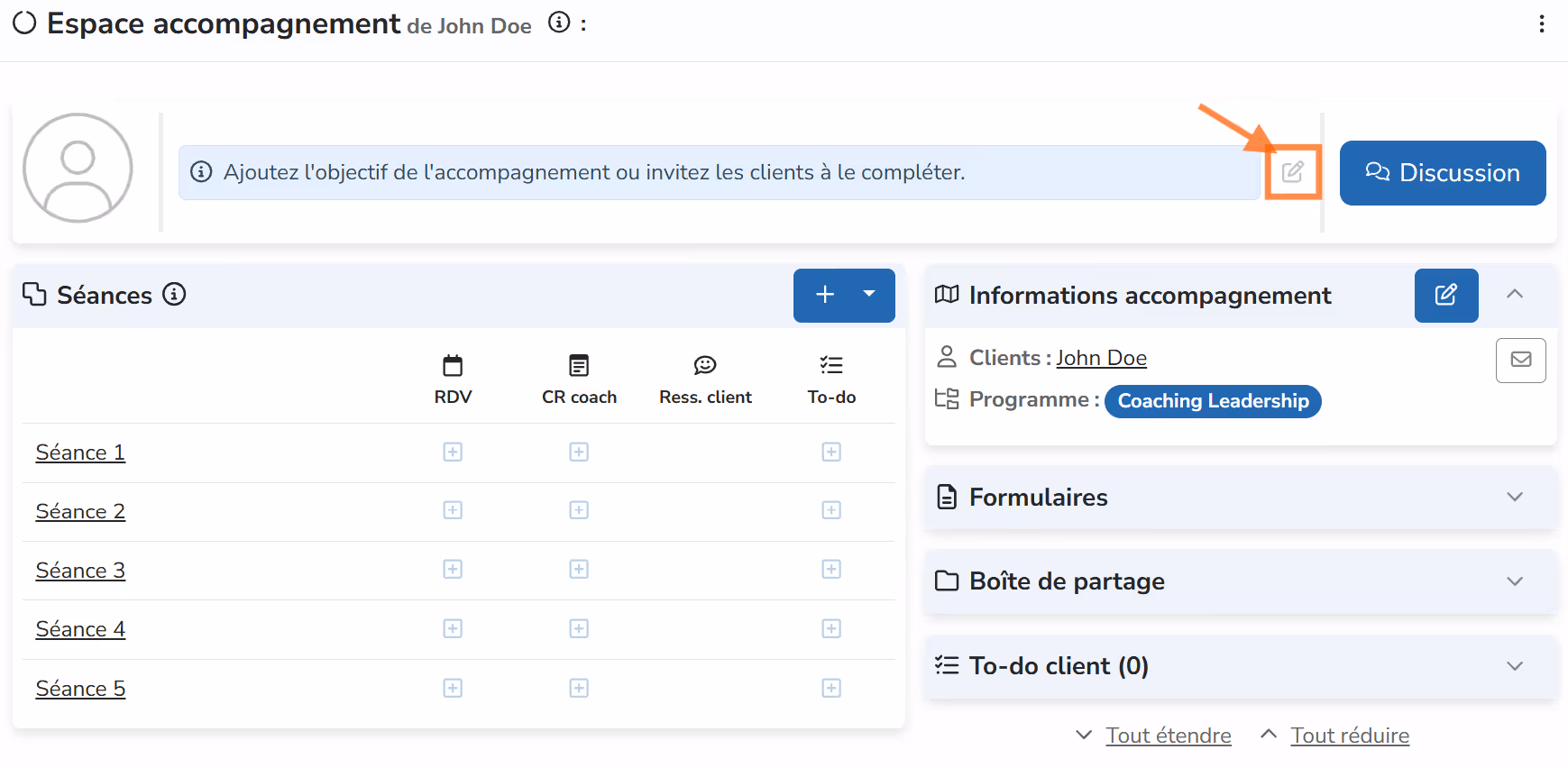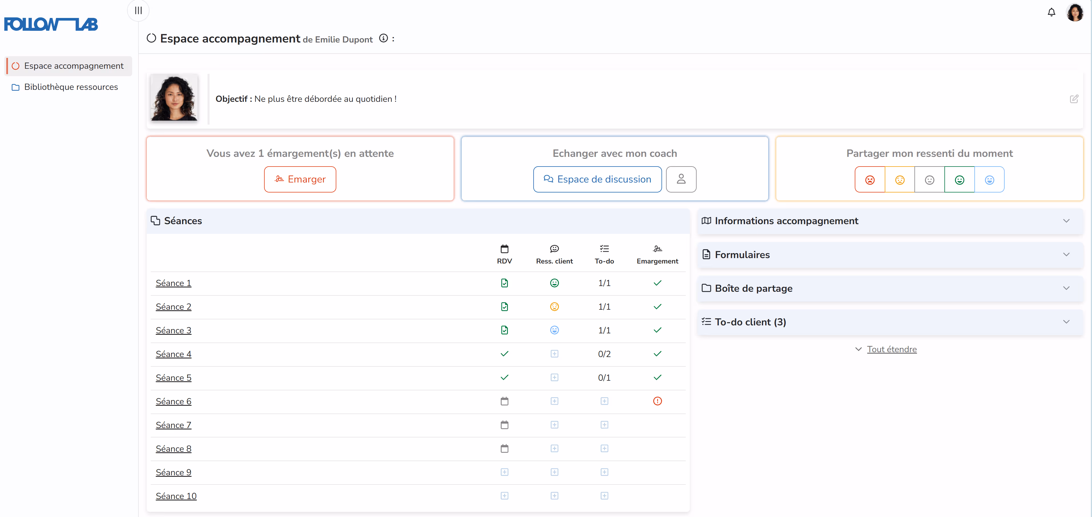 En revenant sur l'espace accompagnement, je peux étendre la section To-do client.