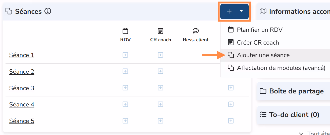 En fonction du paramétrage de mon programme, une liste de séances sera alors automatiquement disponible pour ce nouvel accompagnement.