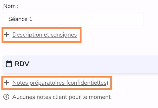 Le client a aussi un espace de notes. Cet espace peut servir pour préparer la séance et/ou enregistrer ses notes après la séance.